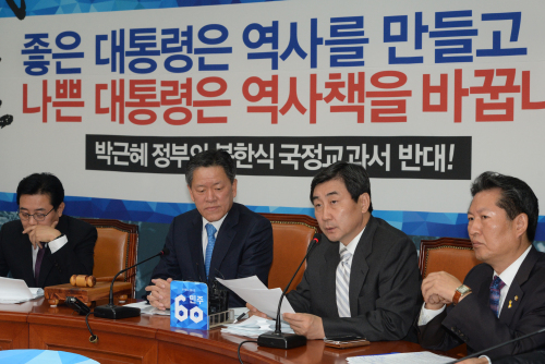 이종걸 원내대표는 "박근혜식 긍정사관으로 무엇을 어떻게 가르치겠다는 것인지 짐작이 된다"며 "올바르지 않은 방법으로 올바른 역사 교과서를 만들 수는 없다"고 강조했다.