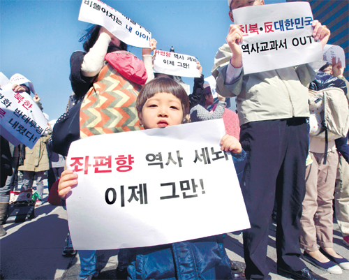 29일 서울 광화문 광장에서 열린 ‘친북·반대한민국 역사교과서 정상화 청년대학생 선언’ 행사에서 참가자들이 현행 검정제 역사 교과서를 비난하는 내용의 피켓을 들고 시위하고 있다. 연합뉴스 |