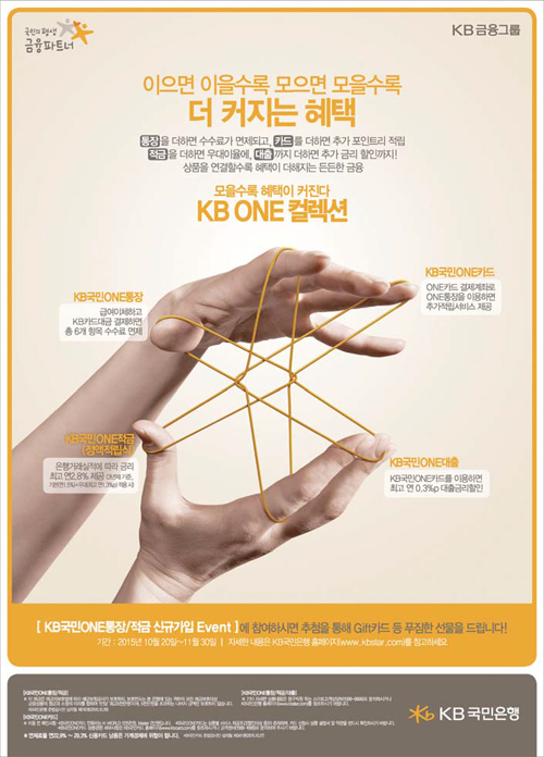 이 광고에서는 이을수록, 모을수록 혜택이 커진다는 콘셉트로 혜택의 내용을 쉽고 간결하게 표현했습니다. 또한 혜택이 모여서 KB를 상징하는 별을 만들면서 혜택이 많다는 의미와 KB의 기업 이미지를 연결하고자 하는 의도가 담겨 있습니다.
