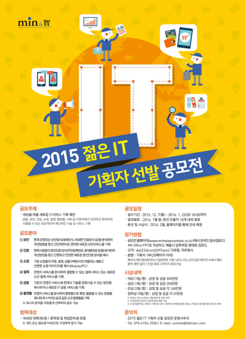 공모전은 오는 12월 7일부터 내년 1월 22일까지 국내외 대학(원)생과 휴학생, 취업 준비생도 지원할 수 있으며 개인 또는 4명 이내의 팀으로도 접수할 수 있다. 분야 제한 없이 1인당 최대 3개까지 공모전 홈페이지(www.minwisecontest.co.kr)를 통해 온라인 제출이 가능하며 2016년 1월 말 본선 진출작을 발표할 계획이다. 최종 본선 및 시상식은 2016년 2월에 공식 홈페이지를 통해 공지되며 공정한 심사를 거쳐 대상, 금상, 은상, 장려상 등 총 1,000만원 상당의 상금과 인턴채용의 혜택을 제공할 예정이다.
