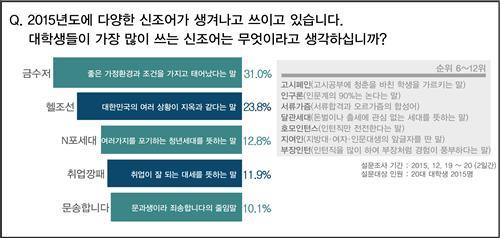 이어 지옥처럼 혹독한 한국 사회를 뜻하는 '헬조선'이 23.8%로 2위에 올랐고, 취업이나 결혼 등 여러가지를 포기해야 하는 세대라는 뜻의 'N포세대'가 12.8%, 상대적으로 취업이 잘되는 학과나 조건을 가리키는 '취업깡패'는 11.9%로 뒤를 이었다.