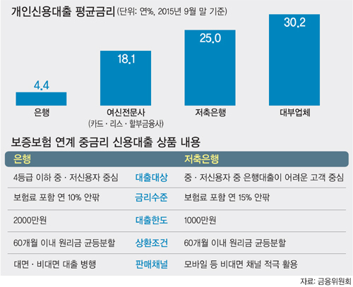 보증보험사가 보증 신상품… 고금리 노출 4~7 신용등급자/10%대 금리로 대출 가능… 올 출범 인터넷 전문은행도 중금리 대출상품 취급키로 보증보험사가 보증하는 은행과 저축은행 중금리 신용대출 상품이 하반기에 1조원 규모로 출시될 전망이다. 중금리 대출을 활성화하기 위한 금융당국 대책으로, 연20∼30%대 고금리에 노출된 중·저신용자들이 10%대 금리로 돈을 빌릴 수 있는 창구가 확대되는 것이다. 당국은 올해 인터넷전문은행 출범을 통해서도 중금리 대출 공급기반을 넓힌다는 구상이다. 산업자본의 인터넷은행 지분율 규제를 완화하는 은행법 개정이 이뤄지면 인터넷은행 2~3곳을 추가로 인가할 계획이다.