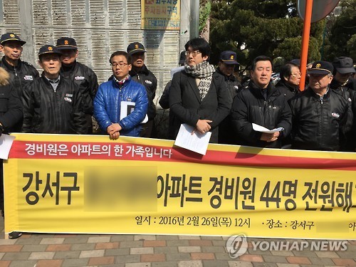 서울 강서구 A아파트 경비원 44명과 아파트 주민, 노동단체로 구성된 '강서구 A 아파트 경비원 44명 전원해고 대책위원회'에 따르면 이 아파트 입주자대표회의는 올해 1월 경비원 고용 대신 대기업이 운영하는 통합보안시스템을 설치하기로 했다.