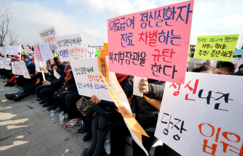 | “의료급여 정신질환자 차별 반대” 25일 정부세종청사 보건복지부 앞에서 열린 ‘의료급여 정신질환자 차별금지 규탄 집회’에서 참가자들이 의료급여 정신질환자에 대한 차별 철폐를 촉구하고 있다. 이들은 “모든 의료급여 진료비는 건강보험의 98%이지만 의료급여 정신질환 환자는 건보의 60% 수준”이라며 “8년 동안 10원도 오르지 않은 정액진료비가 정신질환자를 차별하고 소외시키고 있다”고 주장했다. 세종=연합뉴스 |