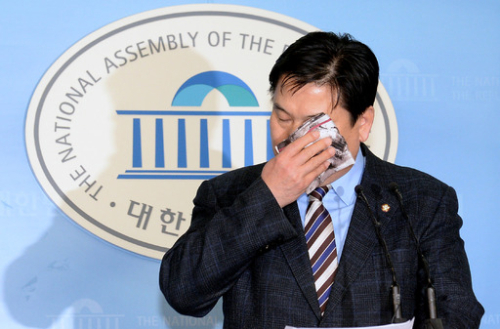 현역 의원 ‘하위 20% 컷오프’에 포함돼 공천에서 원천 배제된 더불어민주당 비례대표 홍의락 의원이 25일 오전 국회 정론관에서 탈당 기자회견을 하던 중 눈물을 닦고 있다. 홍 의원은 이날 무소속 출마 입장을 밝혔다.