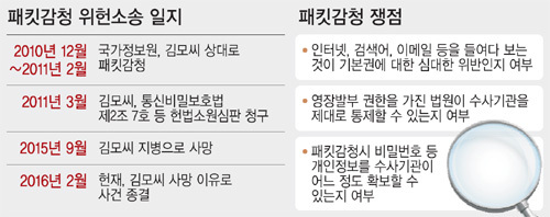 법조계에서는 패킷감청에 대해 “범죄사실과 무관한 내용까지 수집할 수 있다”며 위헌성 견해가 적지 않았다. 아울러 수사 대상자뿐 아니라 같은 회선을 사용하는 다른 사용자의 정보까지 파악할 수 있어서 ‘감청 오·남용’ 가능성에 대한 비판도 상당했다. 하지만 헌재가 꿈쩍도 안 한 사이에 김씨는 암에 걸렸고 지난해 9월 세상을 떠났다.
