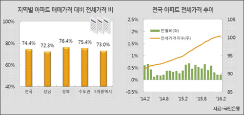 26일 KB국민은행(은행장 윤종규)에 따르면 2월 전국 아파트 전세가율은 74.4%로 집계돼 역대 최초로 74%대에 진입했다. 서울 아파트 전세가율도 전월(73.8%) 대비 0.4%포인트 오른 74.2%를 기록, 역시 처음으로 74%선을 돌파했다.