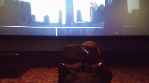 뇌병변 1급 장애인 최강민씨가 24일 서울 영등포구의 한 대형 멀티플렉스 영화관 맨 앞좌석에서 스크린을 올려다보고 있다. |