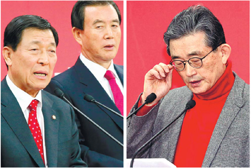 | 새누리당 이한구 공천관리위원장이 10일 오전 여의도 당사에서 김무성 대표 지역구를 경선 지역에 포함하지 않은 2차 공천 결과를 발표하며 명단을 살펴보고 있다.(오른쪽 사진) 공관위 부위원장인 비박(비박근혜)계 황진하 사무총장(왼쪽 사진 왼쪽)과 홍문표 제1사무부총장(〃 오른쪽)은 이날 오후 김 대표 지역구를 경선지역 발표에 포함하기로 한 전날 공관위 결정을 이 위원장이 일방적으로 뒤집었다며 공관위 보이콧을 선언했다. 이재문 기자 |