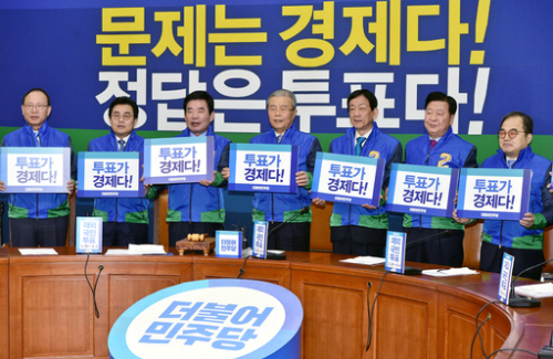 | 더불어민주당 김종인 비상대책위 대표가 28일 오전 국회에서 열리는 중앙선거대책위원장단회의에 앞서 선대위 부위원장단과 재외선거 투표 독려 캠페인을 하고 있다. 이재문기자 |