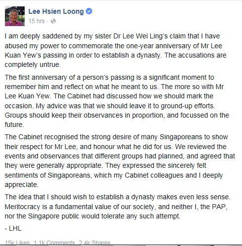 | 리셴룽 싱가포르 총리가 동생의 주장을 반박하기 위해 페이스북에 게재한 글[리셴룽 페이스북 캡처] |