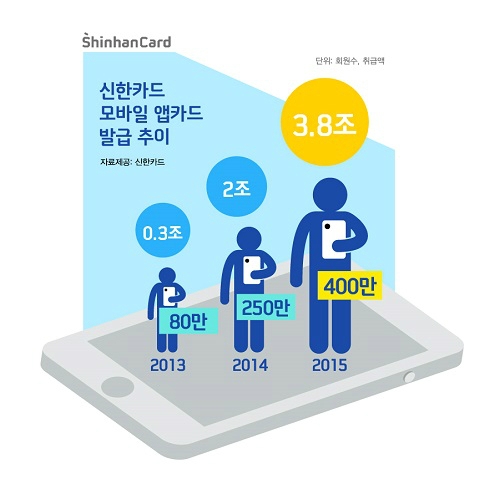 신한 앱카드는 2013년 4월 출시 이후 그해에만 회원 수 80만명(취급액 3000억원)을 달성한 후 2014년 250만명(2조원), 2015년 400만명(3조8000억원)을 기록하는 등 지속적으로 증가하고 있다.