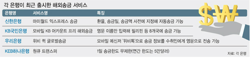 은행권의 해외송금 서비스가 진화하고 있다. 받는 사람의 계좌번호를 몰라도 돈을 해외로 보낼 수 있고, 송금한 뒤 10분만 지나면 돈을 찾을 정도다. 송금수수료도 종전에 비해 훨씬 싸다. 지난 3월부터 핀테크 업체, 보험사, 증권사 등 비은행 금융기관이 소액 외환이체 업무를 할 수 있게 돼 해외송금 서비스 시장의 경쟁이 갈수록 치열해질 전망이다.