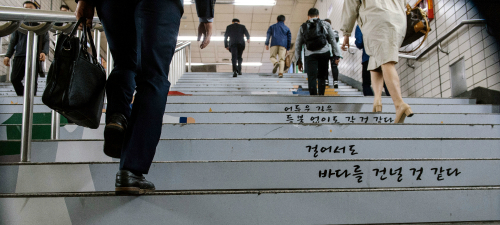 | 야근을 마치고 아침 햇살을 받으며 기지개를 켜고 있다. 다시 5호선 답십리역 4번 출구다. 그의 얼굴에 묻은 빛과 미소가 다행스럽다. |