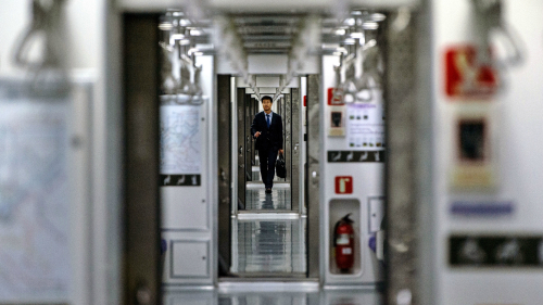 | 운행 중인 지하철 맞은편으로 다른 전동차가 다가오고 있다. 손을 들어 인사했다. |