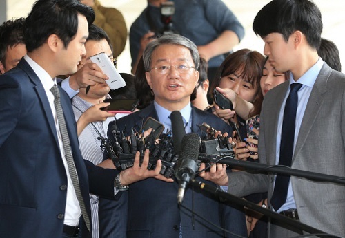 검사장 출신 홍만표 변호사가 법조비리 사건 피의자로 검찰에 출석하며 취재진의 질문에 답하고 있다. 법조윤리협의회는 법조비리 파문이 커지자 홍 변호사 같은 전관 변호사들의 사건 수임 내역 전수조사에 나섰다.