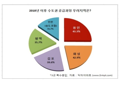 2018년 이후 공급과잉이 우려되는 수도권 지역으로는 용인(43.3%)과 화성(42.9%)이 꼽혔다. 김포(39.3%)와 평택(35.7%)이 그 뒤를 이었다. 지방에서는 대구(69.8%)와 부산(59.0%)이란 응답이 가장 많았다.