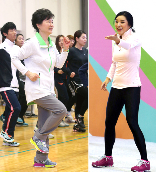 | 체조할 때까지만 해도… 박근혜 대통령과 유명 헬스트레이너 정아름씨(오른쪽)가 지난 2014년 11월 서울 송파구 올림픽공원에서 열린 ‘문화가 있는 날’ 행사에서 늘품체조를 하고 있다. 정씨는 자신이 제작한 것으로 알려진 ‘늘품체조’와 관련해 문화체육관광부로부터 거짓 해명 요구를 받았다고 주장하는 글을 지난 29일 블로그에 올려 파문이 확산되고 있다. 연합뉴스 |