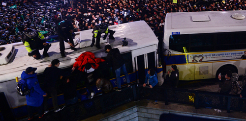 | 지난 12일 민중총궐기 촛불집회 종료 후 서울 종로구 경복궁역 인근 내자동로터리에서 “청와대로 향하자”는 일부 시위대와 이를 막는 경찰이 대치하던 중 한 참가자가 경찰 차벽을 오르고 있다. 연합뉴스 |