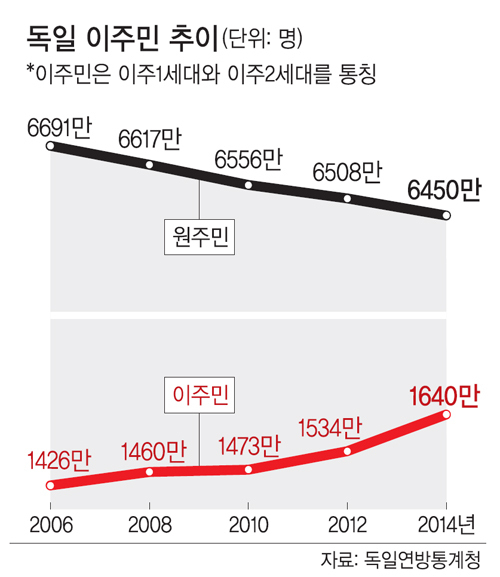 독일연방통계청에 따르면 지난해 기준 전체 이주민은 1711만8000여명으로, 전체 독일인구(8140만4000여명)의 약 21%를 차지한다. 이주민은 이주1세대와 부모가 이주한 이주2세대를 통칭한다.