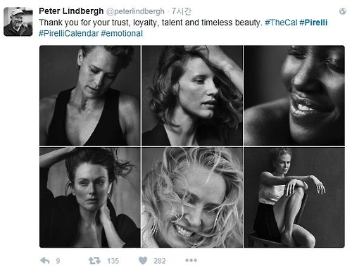 29일(현지시간) 미국 CNN방송 등에 따르면 이탈리아 타이어업체 피렐리가 제작하는 피렐리 달력 2017년도판에는 누드 사진 대신 최소한의 보정작업만을 거친 화장기 없는 여배우들의 사진이 실린다.