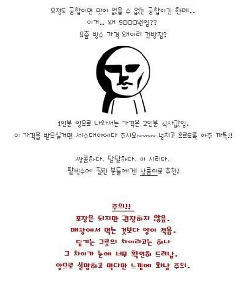 그는 과거 부산의 한 빙수 전문점을 찾아 "요(이)정도 궁합이면 맛이 없을 수 없는 궁합이긴 한데..." "이거 왜 9000원임?? 요즘 빙수 가격 왜 이리 건방짐?"이라는 글을 블로그에 올렸다. 이어 "1인분 양으로 나와서는 가격은 2인분 식사 값임"이라며 "양으로 실망하고 먹다 만 느낌에 화남 주의"라는 주의 문구를 달기도 했다.
