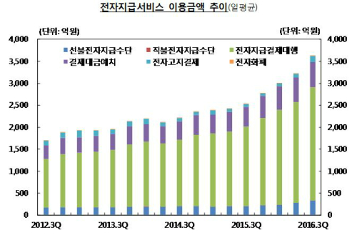 19일 한국은행이 발표한 ‘2016년 3분기 중 전자지급 서비스 이용 현황’에 따르면 올 3분기 전자금융업자 및 금융회사가 제공하는 전자지급서비스의 이용실적(일평균)은 2117만건, 3631억원으로 전기 대비 각각 1.6%, 12.8% 증가했다. 이용금액은 2007년 관련 통계 집계 이후 역대 최대치다.