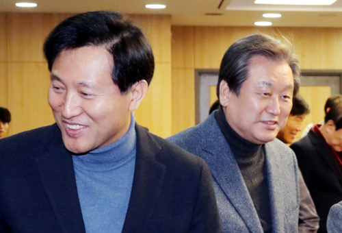 | 새누리당 탈당과 신당 창당을 선언한 김무성 전 대표(오른쪽)와 탈당 여부를 고민 중인 것으로 알려진 오세훈 전 서울시장이 25일 오전 국회의원회관에서 열린 원외위원장 간담회에서 각각 참석자들과 인사하고 있다. 연합뉴스 |