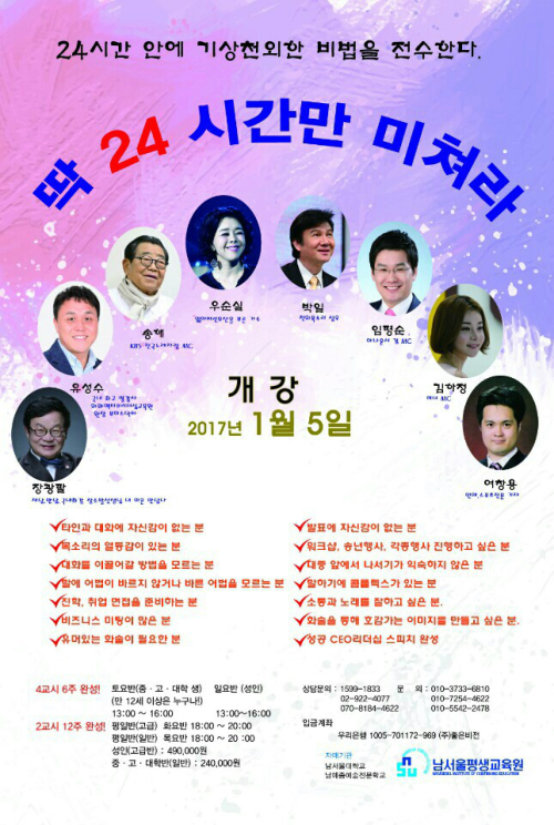남서울평생교육원은 '딱 24시간만 미쳐라'라는 주제로 강좌를 연다. 수업은 오는 2017년 1월 5일에 개강하며, 4교시 6주 완성반과 2교시 12주 완성반으로 구성됐다. 6주 완성반은 학생들로 구성된 토요반과 성인들로 구성된 일요반이 있다. 12주 완성반은 화요일과 목요일 고급반과 일반반으로 나뉘어진다.
