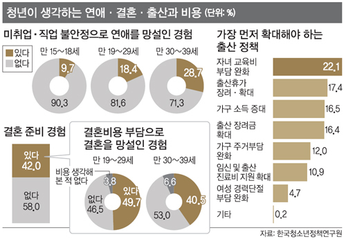30일 한국청소년정책연구원이 전국 15∼39세 남녀 2500명을 대상으로 실시한 ‘2016년 청년 사회·경제 실태조사’에 따르면 결혼을 준비해본 적이 있는 응답자의 41.4%가 ‘비용 부담으로 결혼을 망설인 경험이 있다’고 답했다.
