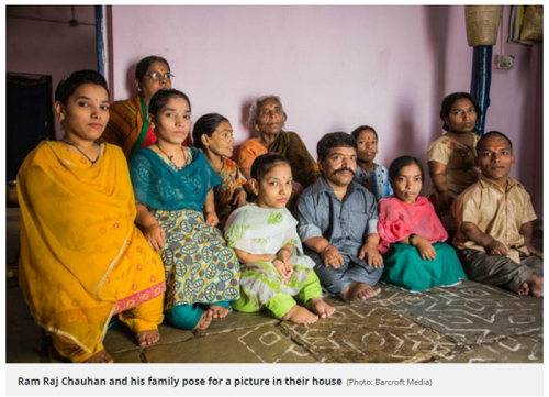 | 인도 텔랑가나주 하이데라바드에 사는 람 라지 차우한(왼쪽 네번째)의 가족 11명의 모습. 연골무형성증에 걸린 9명은 팔과 다리가 정상인보다 짧다. |