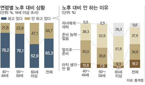 40∼49세의 21.8%가 노후 준비를 안 하고 있다고 답했고 50∼59세의 23.9%, 60세 이상의 47.1%도 별다른 대비책 없이 노후를 맞은 것으로 나타났다. 이들은 국민연금, 기타공적연금, 사적연금, 퇴직급여, 예금적금, 부동산운용 중에서 노후를 위한 방편을 하나도 갖추지 못했다.