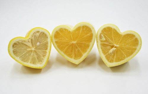 | 칼로 자른 하트 모양 레몬의 단면. 이 레몬을 쓰면 따로 모양을 내려고 수고할 필요가 없으며, 시각적인 즐거움도 누릴 수 있다. |
