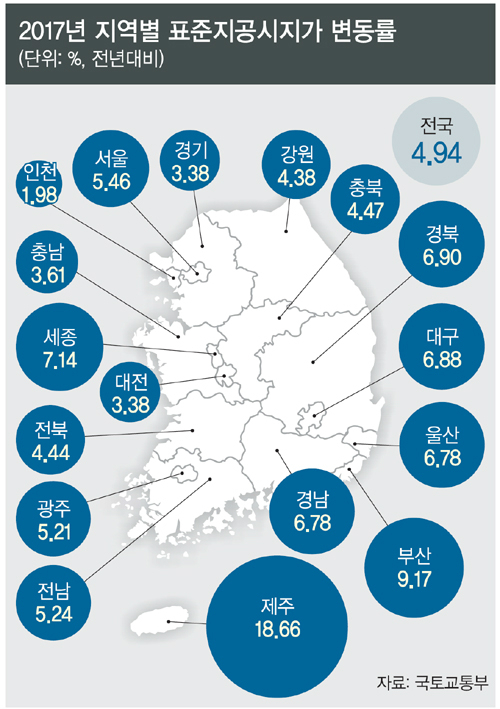22일 국토교통부가 발표한 2017년 1월1일 기준 전국 표준지 50만필지의 공시지가 자료에 따르면 올해 전국 표준지 공시지가 평균 상승률은 4.94%로 집계됐다. 2014년 이후 4년 연속 전년 대비 상승세를 기록 중이다. 국토부가 조사·평가하는 표준지 공시지가는 각종 토지 관련 세금의 과세기준이 되면 전국 약 3230만필지에 대한 개별지가 산출에 활용된다.