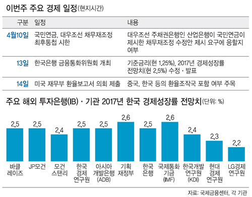 이에 따라 오는 13일 예정된 한국은행 금융통화위원회에서는 기준금리가 동결될 가능성이 더 커졌다. 한은은 2016년 6월 기준금리를 0.25%로 내린 뒤 현재까지 금리를 동결했다. 미국이 기준금리 인상에 나서면서 국내에서는 경기부양을 위해 금리를 인하해야 한다는 주장과 자본 유출을 우려해 금리 인상이 필요하다는 주장이 팽팽하게 맞섰다. 한은 금융통화위원을 지낸 강명헌 단국대 경제학과 교수는 “우리나라 수출지표가 좋아지고 있지만 내수는 더 지켜봐야 한다”며 “경기가 살아난다고 해서 금리를 올리면 경기 회복세에 찬물을 끼얹을 우려가 있다”며 금리동결 가능성을 점쳤다. 한은은 이날 올해 한국 경제성장률 전망치(현 2.5%)도 수정, 발표한다. 해외의 국내 경기회복 전망에도 우리 경제 앞에는 대우조선해양 사태와 미국의 보호무역주의 공세 등 악재가 산적해 있다.