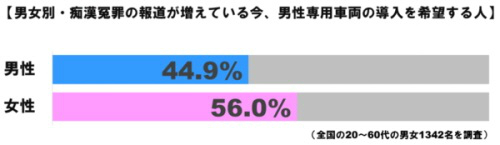 일본 리서치 포털이 최근 빈번한 지하철 성추행 문제에 관해 20~60세 남녀 1350명에게 의견을 물은 결과, 남성 44.9%는 ‘남성 전용칸 도입’하여 치한으로 오해받는 일이 없도록 하자고 주장했다.