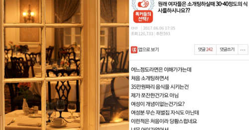 지난 6일 한 온라인커뮤니티 게시판에는 "원래 여자들은 소개팅할 때 30만 원 짜리 식사를 하나요?"라는 제목의 글이 올라왔다.
