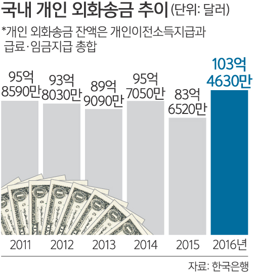 해외송금업은 날로 커지는 황금시장이다. 2016년 개인 외화송금 규모는 103억4630만달러로 2011년 95억8590만달러 대비 5년 새 7억6040만달러나 늘었다. 특히 은행과 핀테크업체들은 국내 거주 중국동포(조선족)와 외국인 근로자들을 타깃으로 서비스를 강화하고 있다. B은행 실무 담당자는 “조선족과 외국인 근로자들이 고향으로 돈을 보내는 송금 시장에 집중하고 있다”고 말했다.