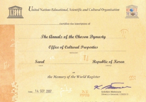 | 국가기록원 부산기록관에 전시된 조선왕조실록 유네스코 기록문화유산 지정서 사본. 지정서는 2007년 발급받은 것으로 기재돼 있다. 국가기록원 제공 |