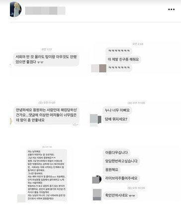 사진 속 캡처화면에는 "딴 건 몰라도 탑이랑 아무것도 안 했었으면 좋겠다", "누나 예쁘다. 담배 뭐 피우나", "탑은 빅뱅이라는 감투에 다시 재기하겠지만 서희씨는 이제 시작하는 단계에서 힘들 거라 생각한다", "남성이 아니라 그냥 서희씨와 같은 편으로 응원하겠다", "아름다우시다. 라이브 자주 틀어달라" 등의 내용의 메시지가 남아있다.