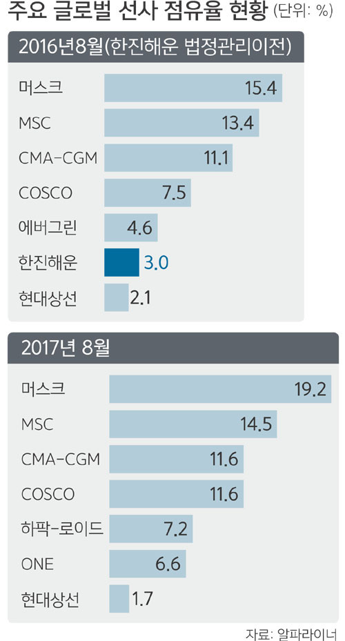 한국 선사의 세계 물동량 점유율도 2015년 11.9%에서 2017년 1~7월 5.7%로 절반 이하로 떨어졌다. 한진해운이 2016년 홀로 점유했던 5.1% 가운데 대부분이 현대상선이 아닌 외국 선사에게 넘어간 꼴이다.