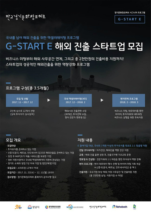 한편, 르호봇은 1인 창조기업 비즈니스 센터를 비롯해 국내외 50개 비즈니스 센터를 운영하는 국내 최다 비즈니스 센터 보유 브랜드로, 19년의 스타트업 인큐베이팅 인프라를 바탕으로 경기도 내 스타트업의 해외진출을 적극 도울 계획이다. 이번 ‘G-START E’ 프로그램 참가에 대한 자세한 사항과 신청방법은 경기문화창조허브 홈페이지와 르호봇 홈페이지에서 확인 가능하다. 신청마감은 오는 12월 11일 오후 6시다.