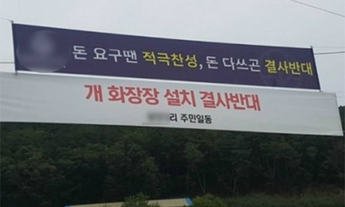 양동면 동물장묘공원 예정지 인근 마을 주변 도로에 지난 9월 ‘동물화장장 설치 결사반대’한다는 내용이 적시된 마을주민들의 현수막이 걸려 있다. 이 현수막 위에 불허가처분을 받은 R사가 내건 ‘돈 요구 땐 적극 찬성, 돈 다 쓰곤 결사반대’라는 문구가 적시된 현수막이 내걸려 묘한 대조를 보인다. 세계일보 자료사진 |