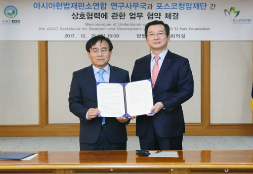 | 21일 아시아헌법재판소연합(AACC) 연구사무국과 포스코청암재단의 업무협약 체결 직후 두 기관을 대표해 김헌정 헌법재판소 사무처장(오른쪽)과 양재운 포스코청암재단 상임이사가 기념촬영을 하고 있다. 헌법재판소 제공 |