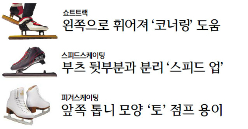 한국의 ‘메달밭’인 쇼트트랙은 111.12m의 코스 중 절반에 가까운 53.81m가 곡선 구간이다. 쇼트트랙의 성패는 코너링에서 속도를 조절하는 데 달렸다. 그래서 쇼트트랙의 스케이트 날은 일반 스케이트 날에 비해 왼쪽으로 휘어져 있다. 코너링할 때 선수들이 왼쪽으로 몸을 기울이기 때문. 곡선에서 빙판과 스케이트 날의 마찰을 줄이기 위해 스케이트 날 중심부를 볼록하게 남겨뒀다.