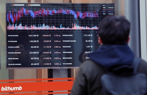 시중 은행들이 가상화폐 거래용 실명 확인 서비스에 나서지 않겠다고 밝힌 지난 12일 서울 중구의 가상화폐 거래소에서 한 시민이 시세 전광판을 바라보고 있다. 연합뉴스 |