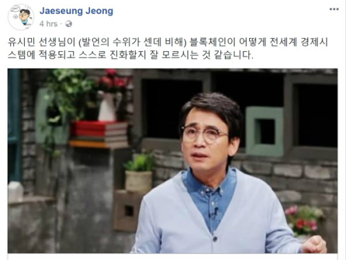 정 교수는 13일 페이스북에 유 작가의 발언을 담은 인터뷰 기사를 게재하고, “유시민 선생님이 (발언의 수위가 센데 비해) 블록체인이 어떻게 전세계 경제시스템에 적용되고 스스로 진화할지 잘 모르시는 것 같습니다”라고 지적했다.