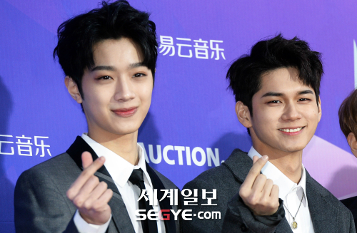 그룹 워너원 라이관린(왼쪽)과 옹성우가 25일 오후 서울 구로 고척 스카이돔에서 열린 '2018 하이원 서울가요대상' 의 레드카펫 행사에 참석해 포즈를 취하고 있다.