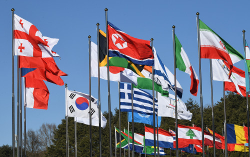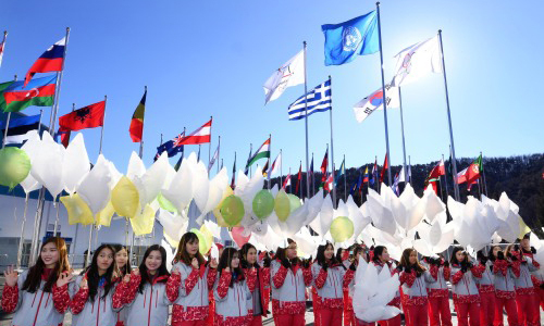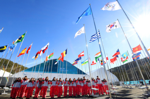 이날 오전 개촌식에 앞서 북한 인공기가 게양됐다. 국내에서 열린 국제스포츠대회에서 인공기 게양은 4번째다. 다른 91개 참가국 국기는 공식 개촌 전날인 지난달 31일 게양됐지만 북한 인공기는 국가보안법 위반 시비를 피하고자 공식 개촌일에 맞춰 게양했다. 인공기는 선수촌 입구 국기광장 끝자락 자메이카 국기 뒤에 걸렸다. 북한 선수들은 모두 강릉선수촌에 입촌했다. 김기훈 강릉선수촌장은 “북한 선수들도 다른 나라 선수들과 마찬가지로 똑같이 생활할 수 있도록 하겠다”며 특별대우가 없음을 시사했다. 이희범 평창동계올림픽 조직위원장은 “47명의 북한 선수단이 참여해 평화올림픽을 더욱 빛낼 것”이라고 기대감을 드러냈다.