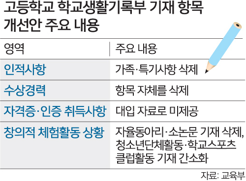 개선안에 따르면 현재 10개인 고교 학생부 기재 사항은 7∼8개로 줄어든다. ‘특정 학생 몰아주기’ 논란이 일었던 교내 경시대회 등 수상경력 영역은 아예 없앤다. 학적사항은 인적사항과 통합되고 진로희망사항은 창의적 체험활동 내 진로활동으로 대체한다.